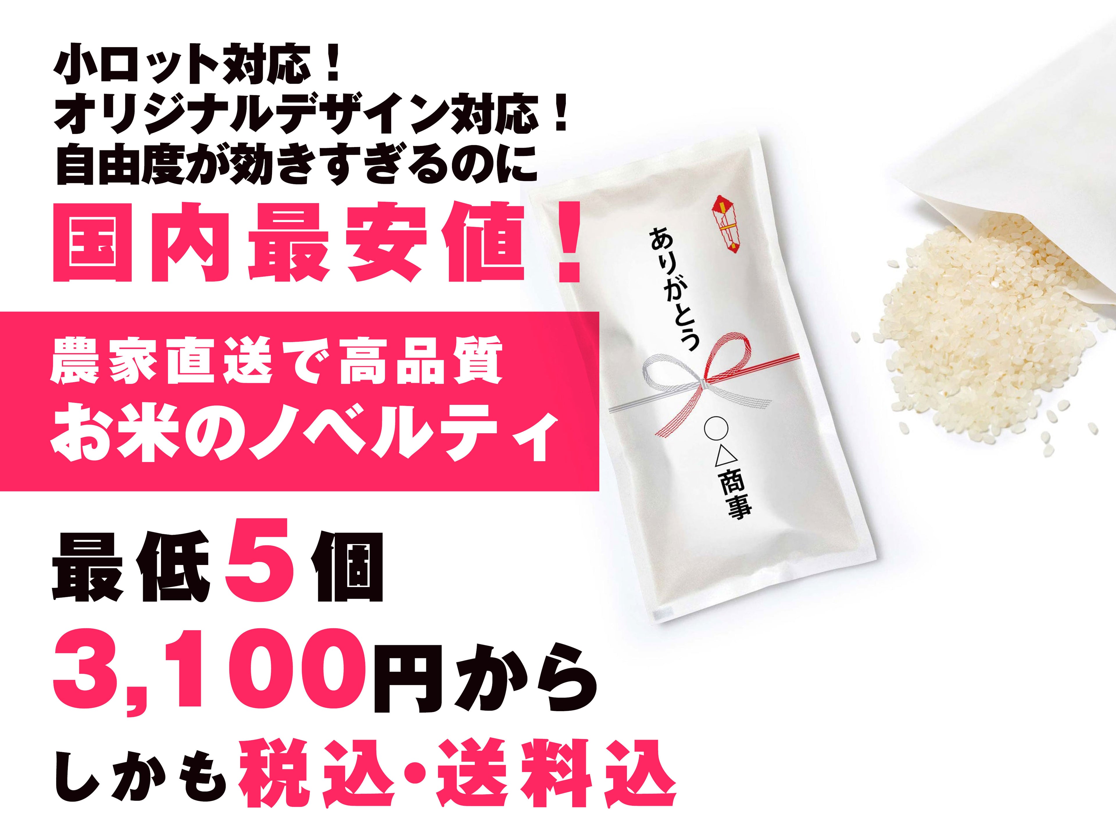 高品質・低価格を実現!絶対に捨てられることがない、印象に残るノベルティ!最低5個(3,100円)から作成できる、お米のオリジナルノベルティです。豊富なデザインの雛形から選ぶお手軽タイプもあり、完全オリジナルも対応可能です。農家直送だからお米の質にも自信あり。